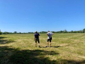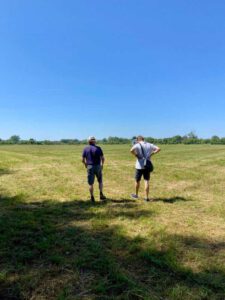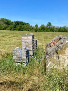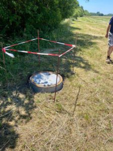 Das erste Ziel war das südwestliche Areal der geplanten Anlage, direkt südlich der Senderstraße. Wir gingen auf das Gelände, das leider erst vor wenigen Tagen gemäht wurde, so dass die Wiese jetzt eher leblos wirkte. Vor der Mahd herrschte hier ein großes Summen und Brummen durch die unzähligen Insekten. Ein Imker hatte dort seine Bienenstöcke platziert und die Bienen waren fleißig unterwegs.