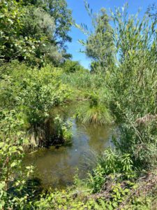 Wir fuhren anschließend weiter zur nordöstlichen Karlshofwiese. Von der dortigen Brücke aus, konnte man die Größe der Wiese sehr gut erkennen. Bisher wird der Grasschnitt zur Fütterung der Karlshofochsen genutzt.