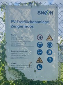 Im Zengermoos baut die SWM Service GmbH eine ca 30.000 m2 (30 ha) große PV Anlage. Die Anlage ist sehr abgelegen und durch eine dichte Hecke entlang der Straße fast nicht sichtbar.