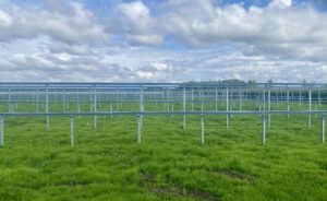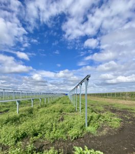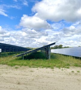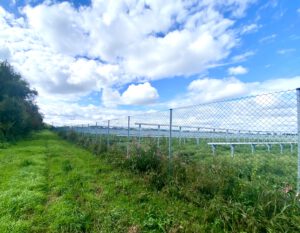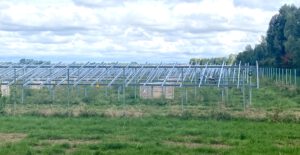 Hier auf diesem Bild sieht man sehr schön, wie niedrig die Anlage aufgeständert ist. Da haben nicht mal Schafe drunter Platz.