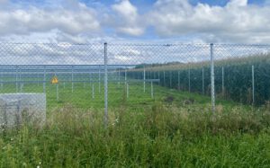 Stacheldraht, Einzäunung bis zum Boden, Verschattung, großflächige Kiesaufschüttung. Ich bin gespannt, wie die Anlage in ein paar Jahren aussieht.