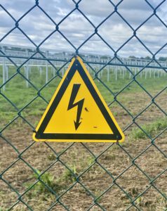 Das Vorsicht Hochspannung Schild vermittelt den Eindruck, dass der Zaun unter Strom steht.