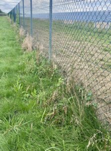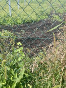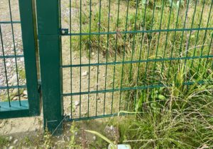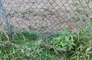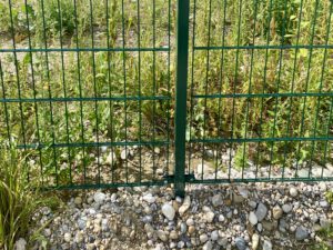 Hier habe ich das Gras mit meinem Fuß runtergedrückt. Der Zaun geht runter bis zum Boden. In Ismaning wird mir immer wieder gesagt, der Zaun bleibt für Tiere durchlässig. Diese Bi