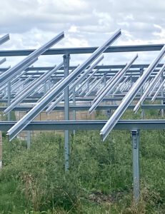Man erkennt sehr gut die Art der Aufständerung. Alle Module werden auf sehr niedrig aufgeständerten Stützen und Querstreben montiert. Insgesamt werden immer 3 PV Module übereinander montiert.