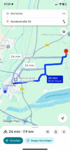 Die Fahrstrecke beträgt ca 7,9 km. Die reine Fahrzeit zum Sender beträgt ca 24 Minuten.
