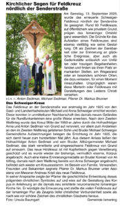 Kurz vor der Genehmigung dieses neuen Areals als weitere Photovoltaikfläche, wurde genau an diesem Areal in Anwesenheit des Landwirts, des ehemaligen Bürgermeisters und des Pfarrers ein Feldkreuz erneuert und mit kirchlichem Segen eingeweiht. Ja, mit göttlichem Segen muss es ja passen.